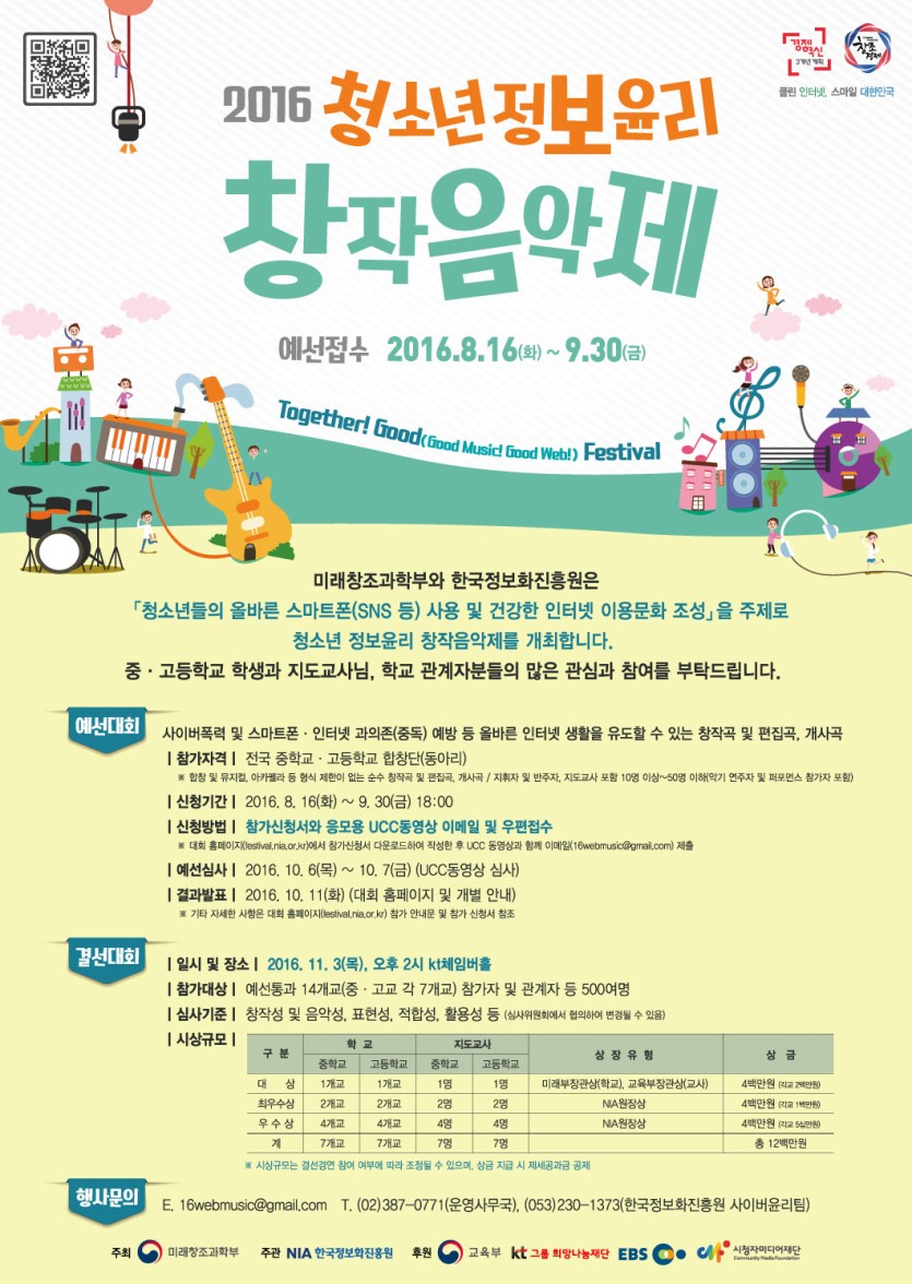 미래부 주최, 2016 청소년 정보윤리 창작음악제 개최(예선접수:8.16.∼9.30.)