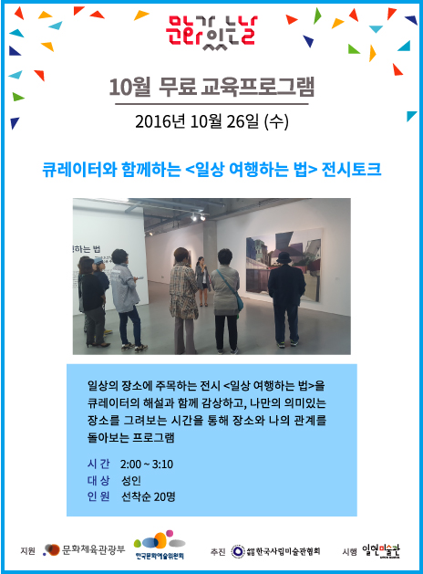 10월에는 <큐레이터와 함께하는 “ 일상 여행하는 법” 전시토크>를 진행합니다. 본 프로그램에 많은 관심 바랍니다.