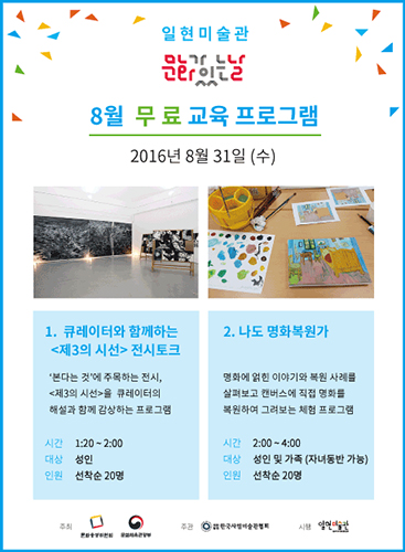 일현미술관은 2016년 ‘문화가 있는 날’을 맞이하여 매달 마지막 주 수요일에 성인과 어린이를 대상으로 하는 다양한 문화예술 프로그램을 선보이고 있습니다.