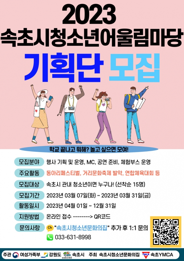 2023 속초시청소년어울림마당 기획단 모집 안내 페이지 정보 작성자 속초청소년문화의집 댓글 0건 조회 114회 작성일 26-01-20 14:04 목록 본문 신청하러가기 -> https://forms.gle/wFkSGJoTMebevtJj8 댓글 0 댓글목록 등록된 댓글이 없습니다.