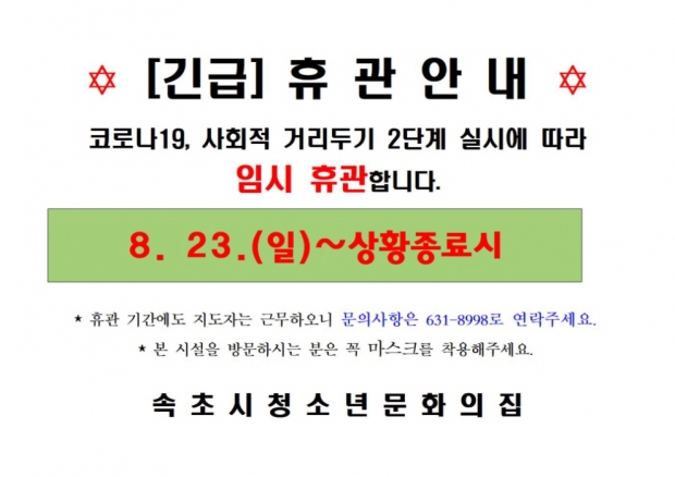 코로나19 확산 방지를 위해 속초시청소년문화의집 전체시설 휴관에 따른 조치사항을 아래와 같이 안내드리오니, 이용에 착오없으시기 바랍니다.