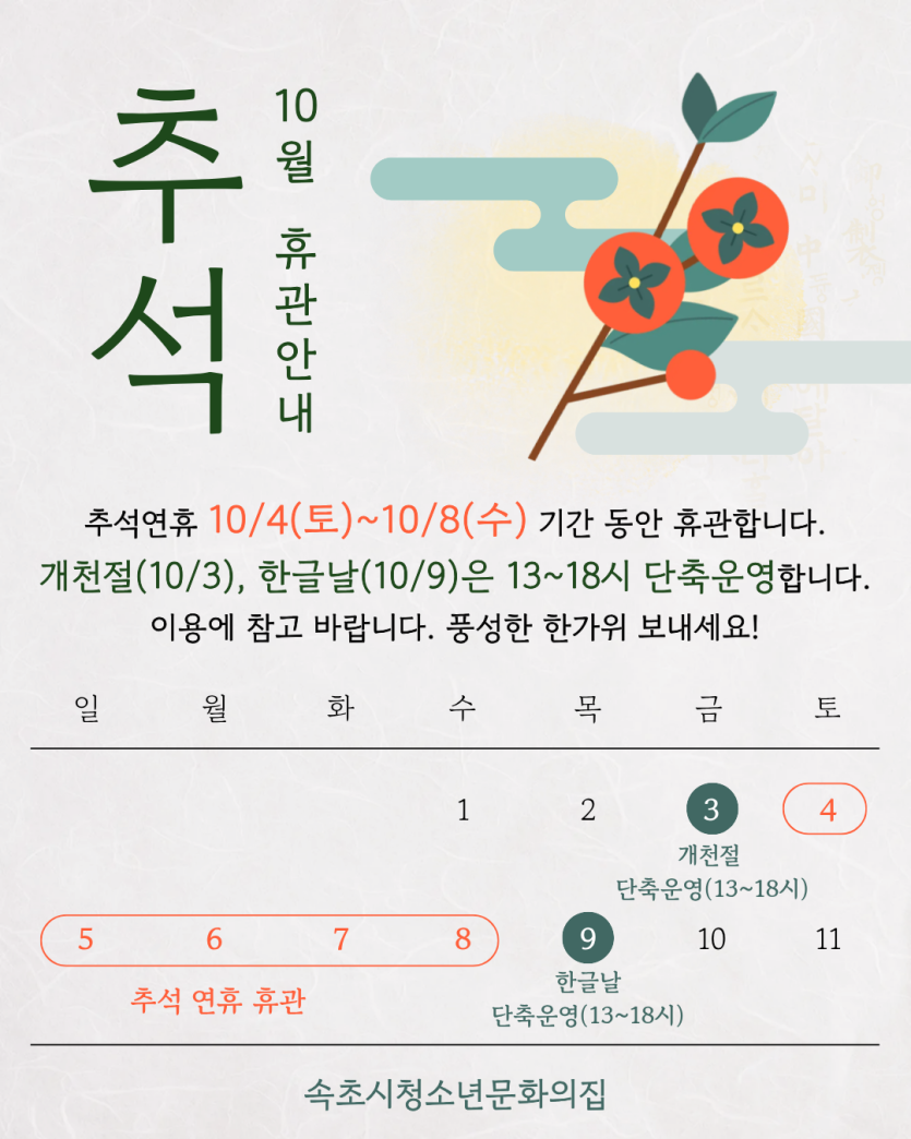 ????추석 휴관 기간 : 10.04(토)~08(수)