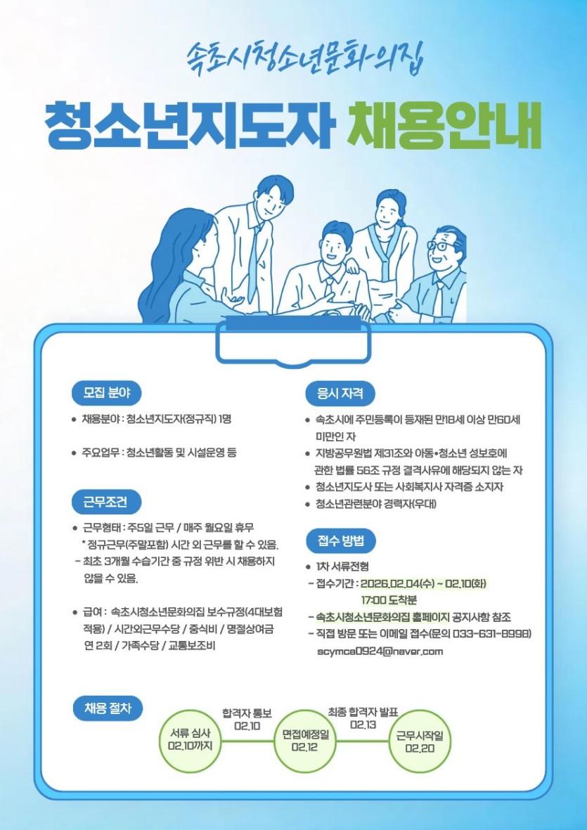 ▶ 기타문의: 속초시청소년문화의집(☎ 631-8998 / 인사담당자)