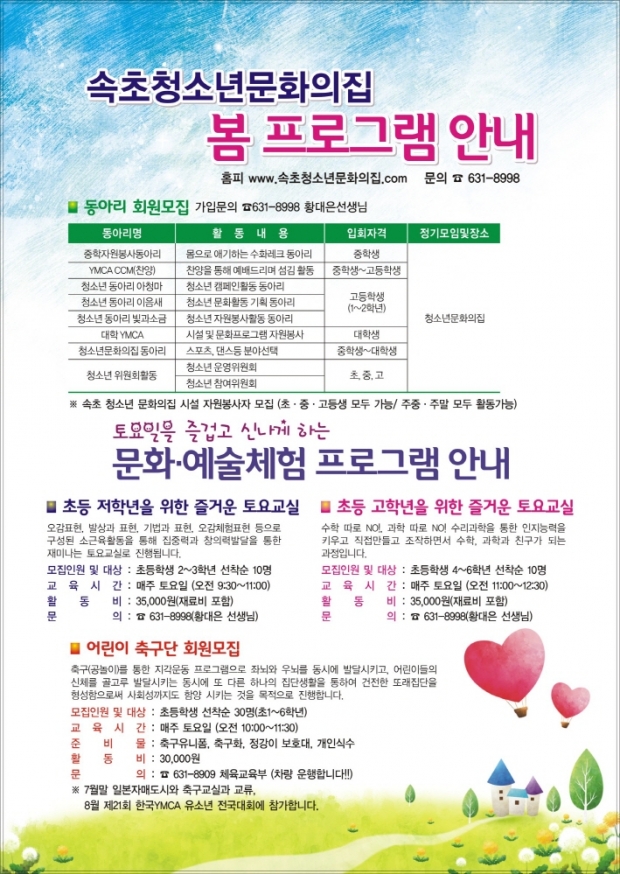 속초청소년문화의집 봄 프로그램 안내 페이지 정보 작성자 속초청소년문화의집관리자 댓글 0건 조회 29회 작성일 26-01-21 11:30 목록 답변 본문 속초청소년문화의집 봄 프로그램 안내 이전글청소년문화의집 Day 26.01.21 다음글놀이연극~부모님과 3 GO! 공감하고! 표현하고! 추억하고! 회원모집 26.01.21 댓글 0 댓글목록 등록된 댓글이 없습니다.